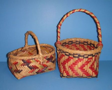 Two Small Choctaw Baskets, one oval in tan, green, black, orange, maroon (7 1/2" w., 6 1/2" h.) one tan, red and black (6 1/2" dia., 11 1/2" h.) Two Small Choctaw Baskets, one oval in tan, green, black, orange, maroon (7 1/2" w., 6 1/2" h.) one tan, red and black (6 1/2" dia., 11 1/2" h.)