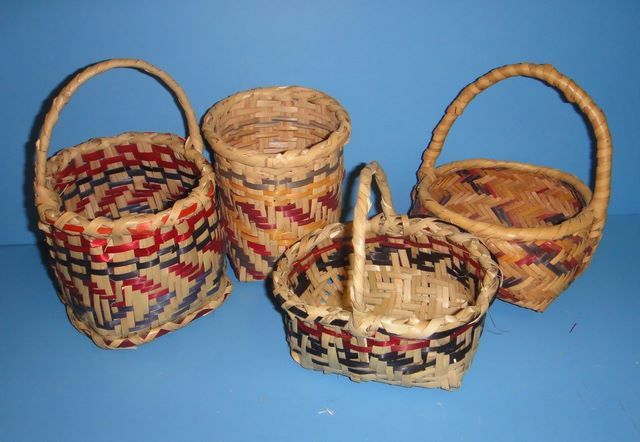 Group of Four Small Choctaw Baskets, one tan, red, black, orange (5 1/2" dia., 6 1/2" h.) one tan, red, black (6" w., 5 1/2" h.) one tan, medium brown, yellow, maroon and red (4 1/2" dia., 5 1/2" h.) one tan, yellow, maroon, medium brown has handle (5" dia., 6 1/2" h.) Group of Four Small Choctaw Baskets, one tan, red, black, orange (5 1/2" dia., 6 1/2" h.) one tan, red, black (6" w., 5 1/2" h.) one tan, medium brown, yellow, maroon and red (4 1/2" dia., 5 1/2" h.) one tan, yellow, maroon, medium brown has handle (5" dia., 6 1/2" h.)