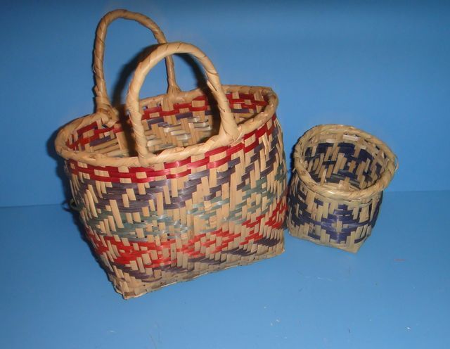 Two Small Choctaw Baskets, one tan, red, black, green, orange, double handle (8" w., 10" h.) one tan and black (4 1/2" dia., 4" h.) Two Small Choctaw Baskets, one tan, red, black, green, orange, double handle (8" w., 10" h.) one tan and black (4 1/2" dia., 4" h.)