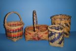 Grouping of Four Small Choctaw Baskets, one in tan, orange, red, green oval with handle (7" w., 8' h.) one tan and black, (4" dia., 4" h.) one tan, red, black, yellow, orange (5 1/2" dia., 8 1/2" h.) one black, tan, yellow (5 1/2" dia., 6" h.) Grouping of Four Small Choctaw Baskets, one in tan, orange, red, green oval with handle (7" w., 8' h.) one tan and black, (4" dia., 4" h.) one tan, red, black, yellow, orange (5 1/2" dia., 8 1/2" h.) one black, tan, yellow (5 1/2" dia., 6" h.)