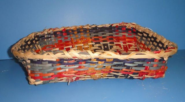 Choctaw Gathering Basket in tan, orange, black, yellow and red 15 1/2" w., 4" h., 3 1/2" d. Choctaw Gathering Basket in tan, orange, black, yellow and red 15 1/2" w., 4" h., 3 1/2" d.