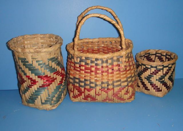 Group of Three Small Choctaw Baskets including one double handle, purse style in tan, green faded red and yellow (8" w., 11 1/2" h.) Group of Three Small Choctaw Baskets including one double handle, purse style in tan, green faded red and yellow (8" w., 11 1/2" h.)