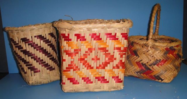 Group of Three Choctaw Baskets, one in tan, red, black, orange with handle (7" dia., 9 1/2" h.) one tan and maroon (6" dia., 7 1/2" h.) one square (9 1/2", 7 1/2" h.) in tan, red and orange Group of Three Choctaw Baskets, one in tan, red, black, orange with handle (7" dia., 9 1/2" h.) one tan and maroon (6" dia., 7 1/2" h.) one square (9 1/2", 7 1/2" h.) in tan, red and orange