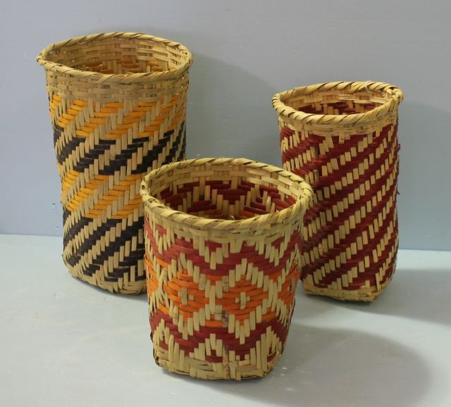 Three Choctaw Baskets; one tan and red ( 5 1/2" dia., 9 1/2" h.) one tan, red, orange (6 1/2" dia., 7" h.) one tan, yellow and black (6 1/2" dia., 10" h.) Three Choctaw Baskets; one tan and red ( 5 1/2" dia., 9 1/2" h.) one tan, red, orange (6 1/2" dia., 7" h.) one tan, yellow and black (6 1/2" dia., 10" h.)