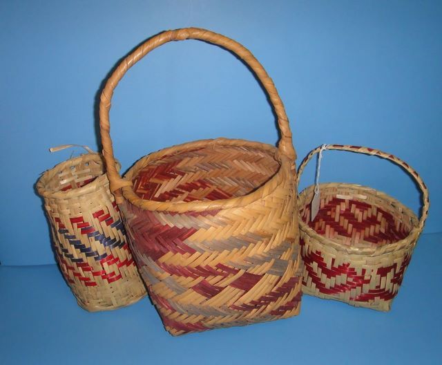 Three Choctaw Baskets; one with handle in tan and red (6 1/2" dia., 8" h.) one in tan, maroon and faded black (7" dia., 14" h.), one tan, black and red (4" dia., 7 1/4" h.) Three Choctaw Baskets; one with handle in tan and red (6 1/2" dia., 8" h.) one in tan, maroon and faded black (7" dia., 14" h.), one tan, black and red (4" dia., 7 1/4" h.)
