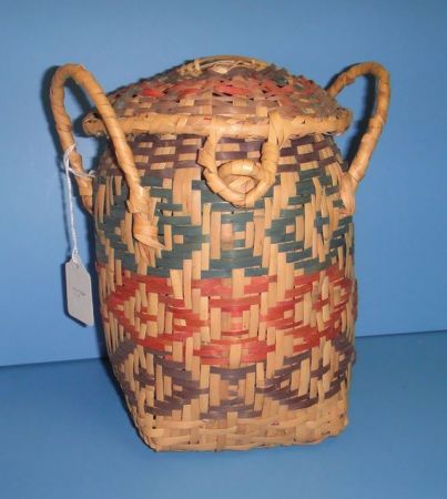 Choctaw Basket with Two Handles and Lid, in tan, green, orange, dark brown and faded black (6' dia., 8 1/2" h.) Choctaw Basket with Two Handles and Lid, in tan, green, orange, dark brown and faded black (6' dia., 8 1/2" h.)