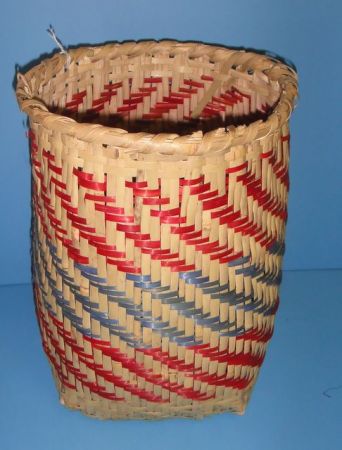 Choctaw Basket in Waste Can Form, tan, red and blue (8 1/2" dia., 11 1/2" h.) Choctaw Basket in Waste Can Form, tan, red and blue (8 1/2" dia., 11 1/2" h.)