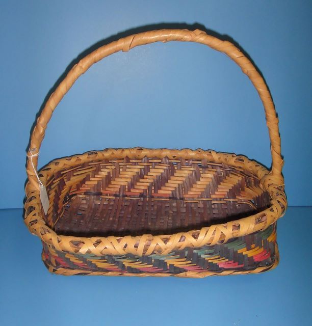 Choctaw Gathering Basket, in tan, yellow, red, black and green with handle (14" w., 14 1/4" h.) Choctaw Gathering Basket, in tan, yellow, red, black and green with handle (14" w., 14 1/4" h.)