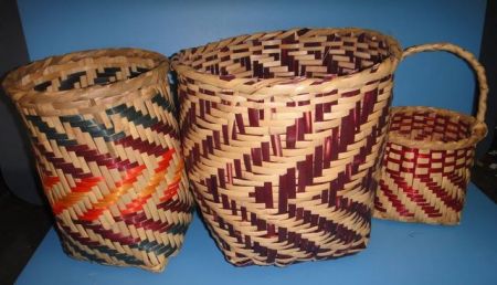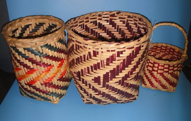 Group of Three Choctaw Baskets, one waste in tan and maroon (11" dia., 10 1/2" h.) one with handle in tan and red (5 1/2" dia., 9" h.) one in tan, green, maroon, yellow and orange (7 1/2" dia., 10" h.) Group of Three Choctaw Baskets, one waste in tan and maroon (11" dia., 10 1/2" h.) one with handle in tan and red (5 1/2" dia., 9" h.) one in tan, green, maroon, yellow and orange (7 1/2" dia., 10" h.)