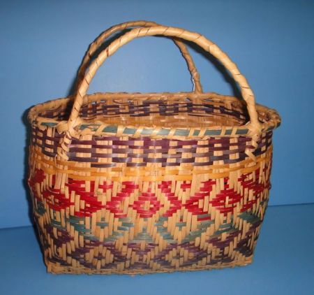 Purse Style Double Handle Choctaw Basket in tan, green, red, yellow and dark brown (11 1/2" w., 12" h., 8" d.) Purse Style Double Handle Choctaw Basket in tan, green, red, yellow and dark brown (11 1/2" w., 12" h., 8" d.)