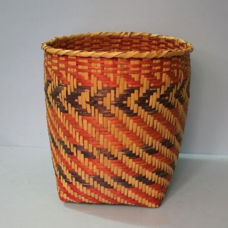 Choctaw Waste Basket in tan, orange and black, no handle; 13" dia., 14 1/2" h. Choctaw Waste Basket in tan, orange and black, no handle; 13" dia., 14 1/2" h.
