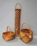 Group of Three Choctaw Baskets; one with handle in tan, yellow and faded black (7 1/2" dia., 13 1/2" h.) one shaped like a tube in tan, maroon and black (4" dia., 23 1/2" h.) one in tan, rust, dark brown, black and aqua (8 1/4" dia., 10" h.) Group of Three Choctaw Baskets; one with handle in tan, yellow and faded black (7 1/2" dia., 13 1/2" h.) one shaped like a tube in tan, maroon and black (4" dia., 23 1/2" h.) one in tan, rust, dark brown, black and aqua (8 1/4" dia., 10" h.)