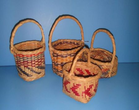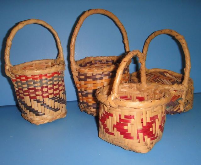 Four Small Choctaw Baskets, one in yellow, tan and faded black with handle (4 1/4" dia., 7 1/2" h.) one in tan, orange, black, grey and maroon (4" dia., 8 1/4" h.) one in tan and red (4" dia., 4 1/2" h.) one in tan, orange, maroon and dark brown (4" dia., 7" h.) Four Small Choctaw Baskets, one in yellow, tan and faded black with handle (4 1/4" dia., 7 1/2" h.) one in tan, orange, black, grey and maroon (4" dia., 8 1/4" h.) one in tan and red (4" dia., 4 1/2" h.) one in tan, orange, maroon and dark brown (4" dia., 7" h.)