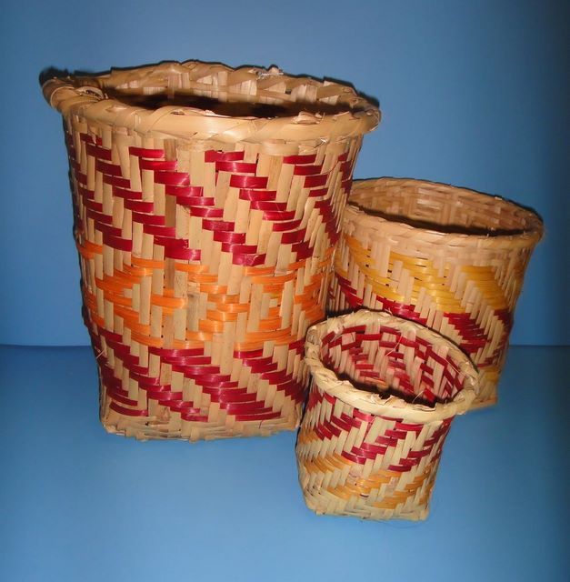Three Choctaw Baskets, one in tan, red and yellow (7" dia., 8' h.) one in tan, red and yellow (7" dia., 8" h.) one yellow, tan and red (4 1/2" dia., 15" h.) Three Choctaw Baskets, one in tan, red and yellow (7" dia., 8' h.) one in tan, red and yellow (7" dia., 8" h.) one yellow, tan and red (4 1/2" dia., 15" h.)