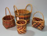 Group of Four Choctaw Baskets, which include; one in tan, green, yellow and maroon with two handles (9" dia., 10" h.) one tan, red and black (6" w., 9" h.) one tan, black and red (6" dia., 11" h.) one with no handle in tan, black , yellow and red (4" dia., 5 1/2" h.) Group of Four Choctaw Baskets, which include; one in tan, green, yellow and maroon with two handles (9" dia., 10" h.) one tan, red and black (6" w., 9" h.) one tan, black and red (6" dia., 11" h.) one with no handle in tan, black , yellow and red (4" dia., 5 1/2" h.)