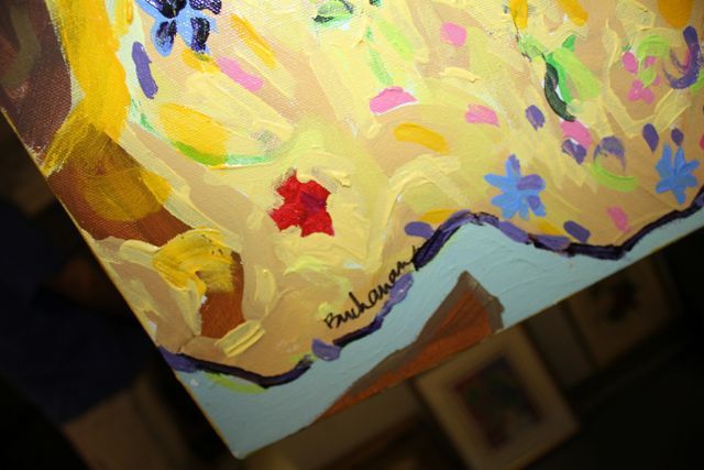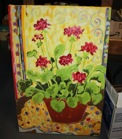 Oil on Canvas of Flower Pot with Vivid Colors, signed Buchanan, unframed; 24" w., 36" h. Oil on Canvas of Flower Pot with Vivid Colors, signed Buchanan, unframed; 24" w., 36" h.