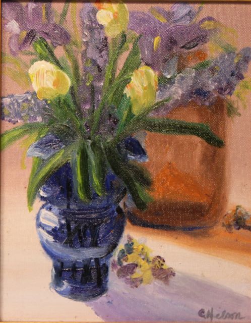 Oil on Canvas of Flowers in Blue Vase, signed C. Nelson, in ornate gold frame; 14" w., 16 1/2" h. Oil on Canvas of Flowers in Blue Vase, signed C. Nelson, in ornate gold frame; 14" w., 16 1/2" h.
