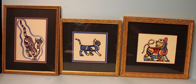 Group of Three Walter Anderson Color silk screens, framed, "Dick Whittington's Cat" (9 1/2" w., 11 1/2" h.) "Blue Kitten" (10" w., 9" h.) "Tiger" (12" w., 10" h.) Group of Three Walter Anderson Color silk screens, framed, "Dick Whittington's Cat" (9 1/2" w., 11 1/2" h.) "Blue Kitten" (10" w., 9" h.) "Tiger" (12" w., 10" h.)