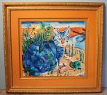 Large Watercolor of Blue Cat with Green Fish, in gold frame; 40" w., 38 1/2" h. Large Watercolor of Blue Cat with Green Fish, in gold frame; 40" w., 38 1/2" h.