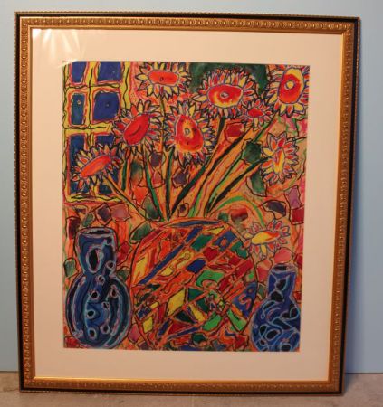 Multi-Color Print of Jars and Flowers; 30" w., 34 1/2" h. Multi-Color Print of Jars and Flowers; 30" w., 34 1/2" h.