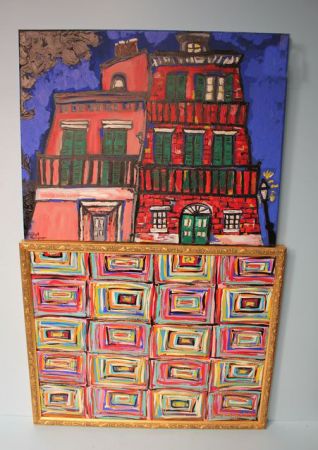 Two Oil Paintings; one framed geometric (21" w., 17 1/2" h.) one of buildings, signed Bridge Champagne, unframed (19 1/2" w., 16" h.) Two Oil Paintings; one framed geometric (21" w., 17 1/2" h.) one of buildings, signed Bridge Champagne, unframed (19 1/2" w., 16" h.)