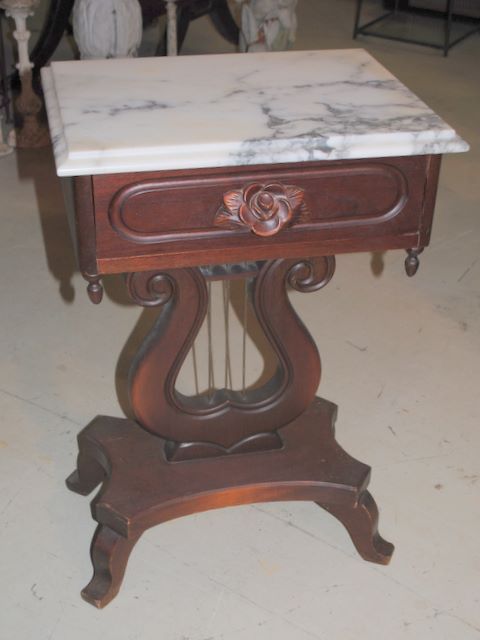 Reproduction Lyre Base Victorian Style Mahogany Marble Top End Table, one drawer; 28" h., 18 1/2" w., 15" d. Reproduction Lyre Base Victorian Style Mahogany Marble Top End Table, one drawer; 28" h., 18 1/2" w., 15" d.