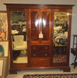 Edwardian (Chinese Chippendale) Influence Wardrobe, center section has two doors flanked by beveled glass doors, bracket feet; 81 1/2" h., 76 1/2" w., 22" d. Edwardian (Chinese Chippendale) Influence Wardrobe, center section has two doors flanked by beveled glass doors, bracket feet; 81 1/2" h., 76 1/2" w., 22" d.