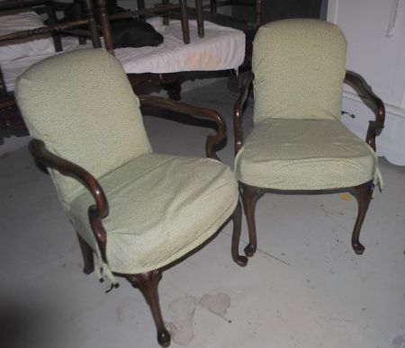 549 Pair of Walnut Upholstered Queen Anne Style Arm Chairs