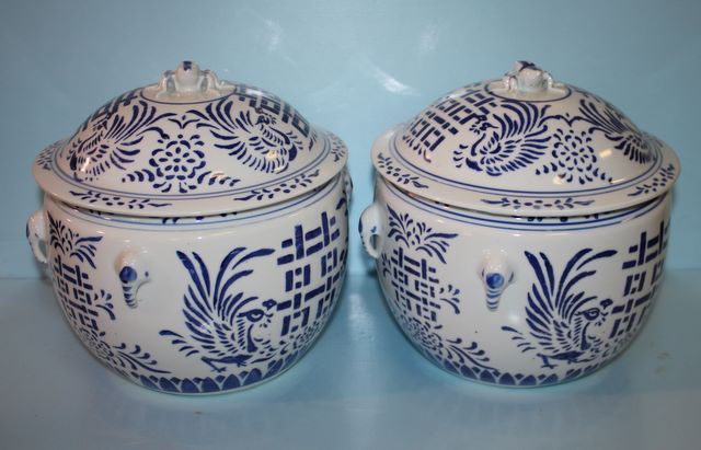 594 Pair of Blue and White Covered Porcelain Jars with Handles