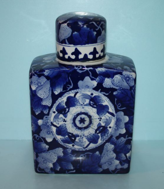 Blue and White Porcelain Covered Square Jar; 9 1/2" h., 6" dia. Blue and White Porcelain Covered Square Jar; 9 1/2" h., 6" dia.