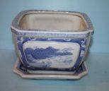 Blue and White Pottery Planter with Under Tray in Oriental Motif; 6 1/2" h. (with tray), 8 1/2" square Blue and White Pottery Planter with Under Tray in Oriental Motif; 6 1/2" h. (with tray), 8 1/2" square