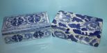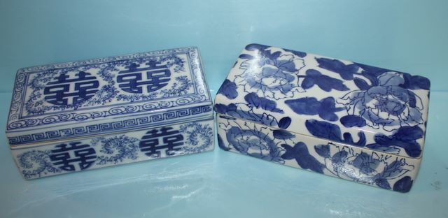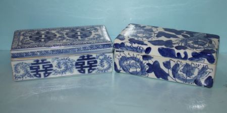 Two Blue and White Porcelain Covered Boxes; both 7 1/2" h., 2 3/4" w., 4" d. Two Blue and White Porcelain Covered Boxes; both 7 1/2" h., 2 3/4" w., 4" d.