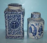 Two Blue and White Covered Porcelain Ginger Jars; one octagonal 6 1/2" h., 4" w. with lid, one 8 1/2" x 4 3/4" square with lid Two Blue and White Covered Porcelain Ginger Jars; one octagonal 6 1/2" h., 4" w. with lid, one 8 1/2" x 4 3/4" square with lid