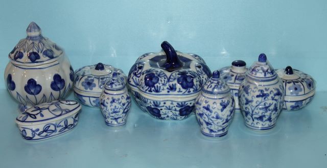 Nine Small Pieces of Blue and White Porcelain Pieces, including; four small ginger jars, three covered pumpkins, two covered trinket boxes, ranging in size from 3 1/2" to 1 1/4" h. Nine Small Pieces of Blue and White Porcelain Pieces, including; four small ginger jars, three covered pumpkins, two covered trinket boxes, ranging in size from 3 1/2" to 1 1/4" h.
