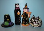 Four Ceramic Halloween Pieces; standing cat 11" h., cat head 5 1/2" x 6", standing witch 11" h., witches hat 5 1/2" h. Four Ceramic Halloween Pieces; standing cat 11" h., cat head 5 1/2" x 6", standing witch 11" h., witches hat 5 1/2" h.