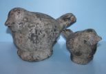 Two Green Pottery Birds, one 6 3/4" h., 9 1/2" w., one 4 1/2" h., 6" w. Two Green Pottery Birds, one 6 3/4" h., 9 1/2" w., one 4 1/2" h., 6" w.