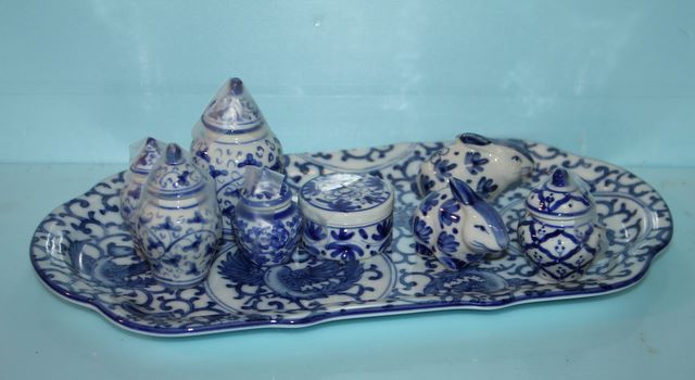 Group of Blue and White Porcelain Pieces; tray (11" l. x 6" w.), two rabbits, five small covered jars (ranging in size from 3" to 1 3/4"), one small covered box (1" x 1 1/2") Group of Blue and White Porcelain Pieces; tray (11" l. x 6" w.), two rabbits, five small covered jars (ranging in size from 3" to 1 3/4"), one small covered box (1" x 1 1/2")