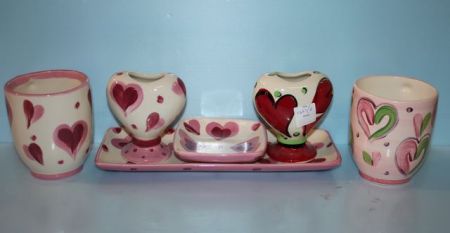 Six Pieces of Hand Painted Gail Pittman Pieces; tray, square tray, two heart vases, two cups; (cup measures 4 1/2" w., 4" h. Six Pieces of Hand Painted Gail Pittman Pieces; tray, square tray, two heart vases, two cups; (cup measures 4 1/2" w., 4" h.