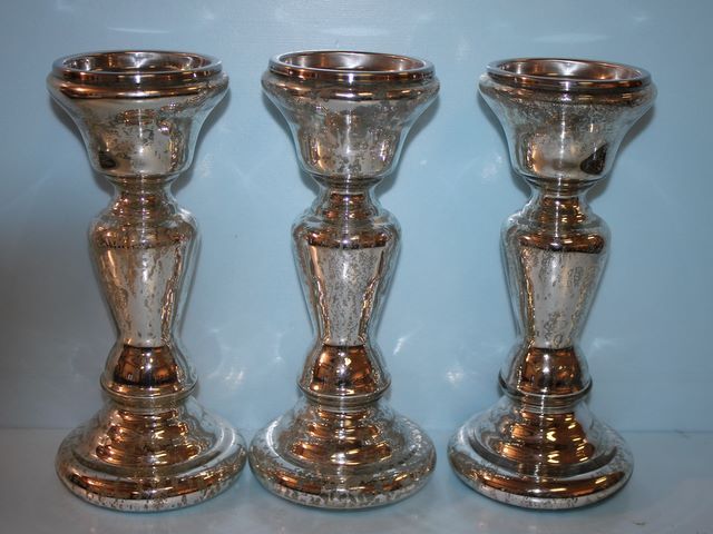 Three Pillar Candle Holders, resemble Mercury glass but not; 10" h., 5" dia. Three Pillar Candle Holders, resemble Mercury glass but not; 10" h., 5" dia.