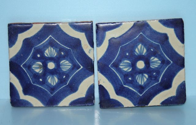 Two Pottery Blue and White Tiles; 4" square Two Pottery Blue and White Tiles; 4" square