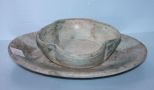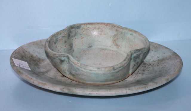 Two Green Pottery Dishes; one oval (Peters) (10 1/4" w.); one indented bowl (Sheila) (6" dia.) Two Green Pottery Dishes; one oval (Peters) (10 1/4" w.); one indented bowl (Sheila) (6" dia.)