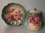 796 Two Hand Painted Pieces; Covered Jar; Plate