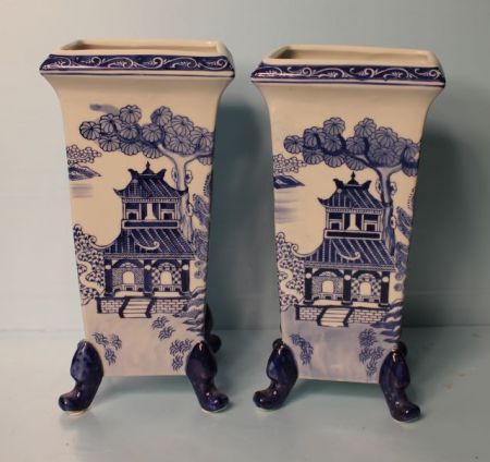 Pair Blue and White Footed Vases; 13" h., 6" square Pair Blue and White Footed Vases; 13" h., 6" square