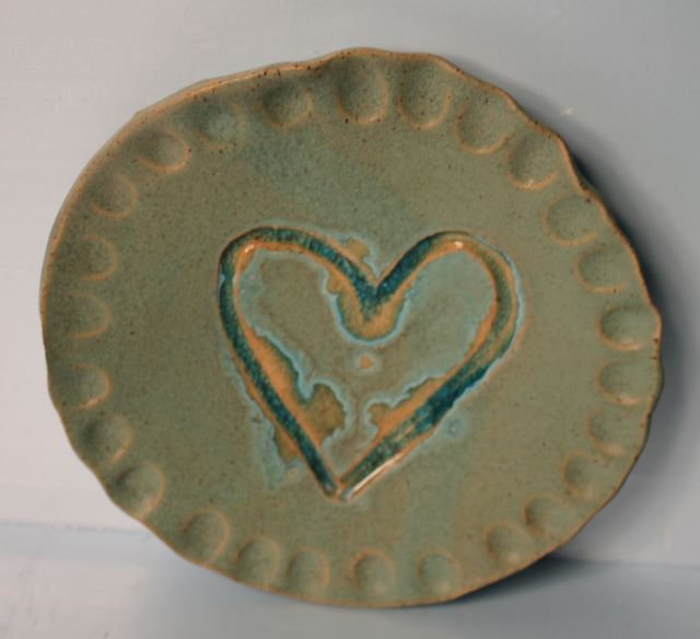 Pottery Plate with thumb print border and heart in the center; 8 1/4" dia. Pottery Plate with thumb print border and heart in the center; 8 1/4" dia.