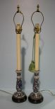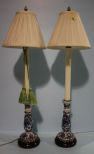 Pair of Blue and White Candlestick Lamps with Shades; 30' h. Pair of Blue and White Candlestick Lamps with Shades; 30' h.