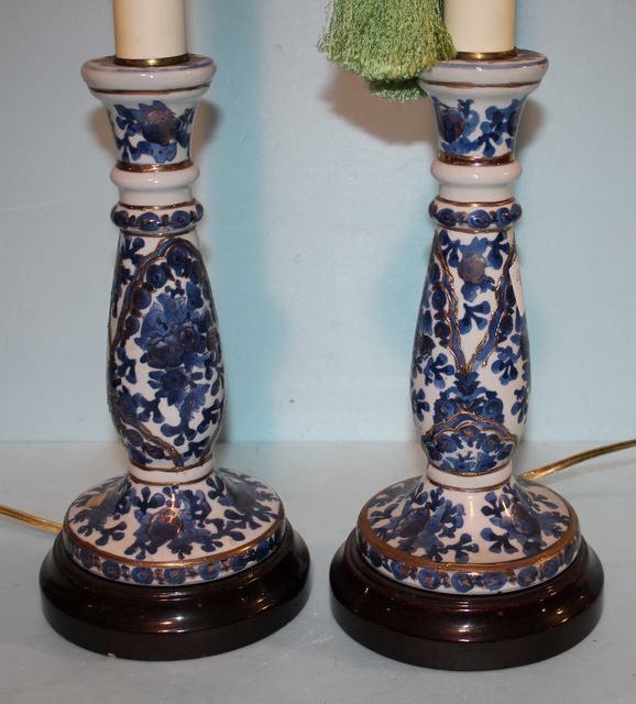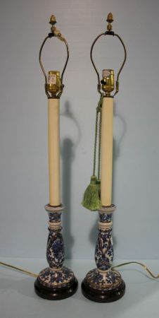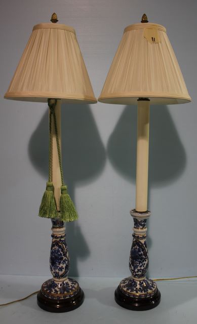 909 Pair of Blue and White Candlestick Lamps with Shades