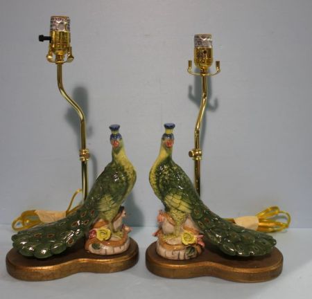 Pair of Porcelain Peacock Lamps on Wood Base; base 9" w., 25 1/2" h. including finial Pair of Porcelain Peacock Lamps on Wood Base; base 9" w., 25 1/2" h. including finial