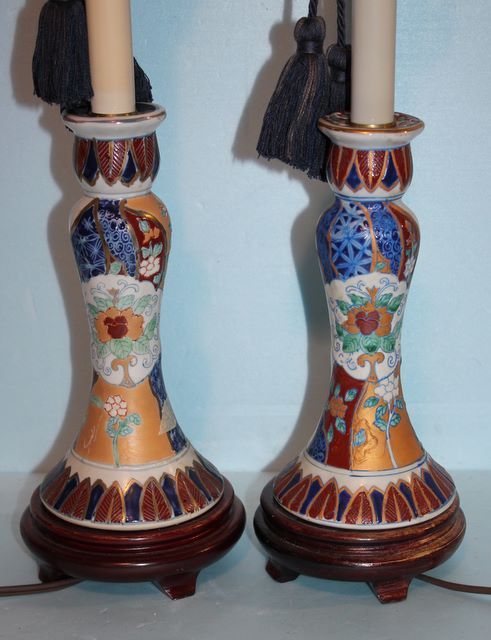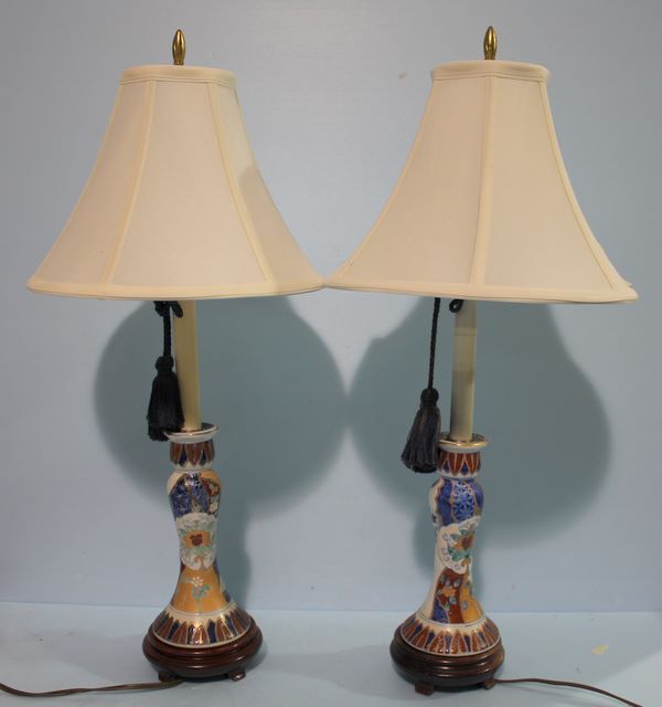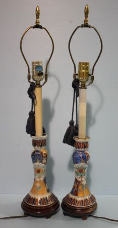 Pair of Porcelain Candlestick Lamps on Wood Base, has tassels; 26" h., including finial Pair of Porcelain Candlestick Lamps on Wood Base, has tassels; 26" h., including finial