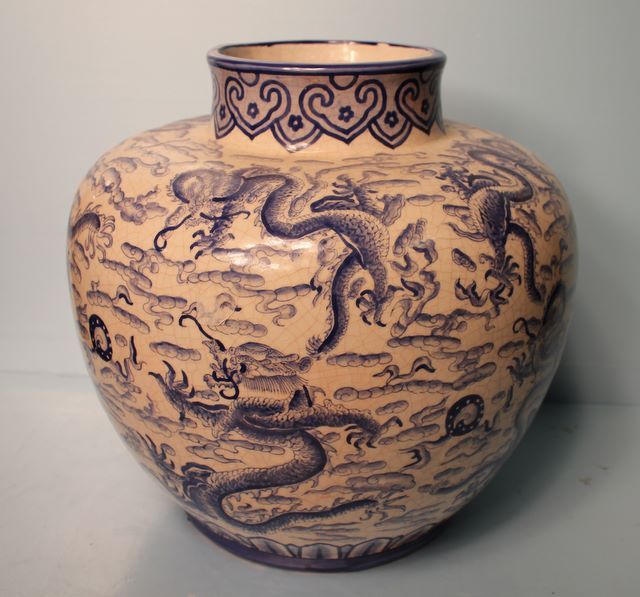Blue and White Bulbous Shape Dragon Vase; 16" h., 14" dia. Blue and White Bulbous Shape Dragon Vase; 16" h., 14" dia.