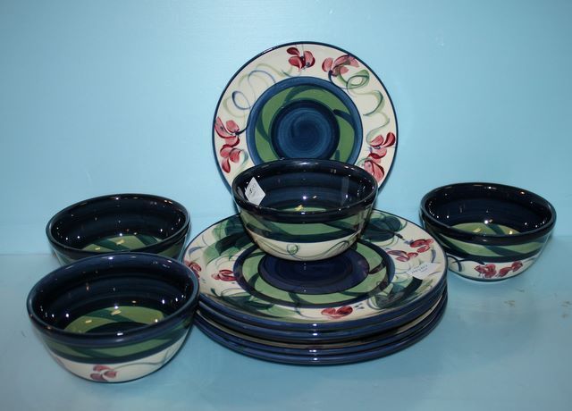 Nine Pieces Gail Pittman; four bowls 5" dia., salad plates 7" dia., four dinner plates 9" dia. Nine Pieces Gail Pittman; four bowls 5" dia., salad plates 7" dia., four dinner plates 9" dia.